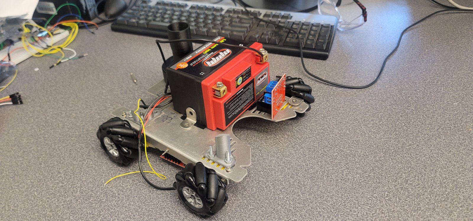 The motor drivers used here are very similar to those written for lab 2, the notable exception being that the off-channel is held low instead of high. Apart from this, it is the same PWM setup. The mecanum driver takes in four motor driver objects and controls all PWM simultaneously. Functions include going forward, backward, and each of the side directions. The direction of the wheels is controlled within the motor driver by either sending a positive or negative speed value.