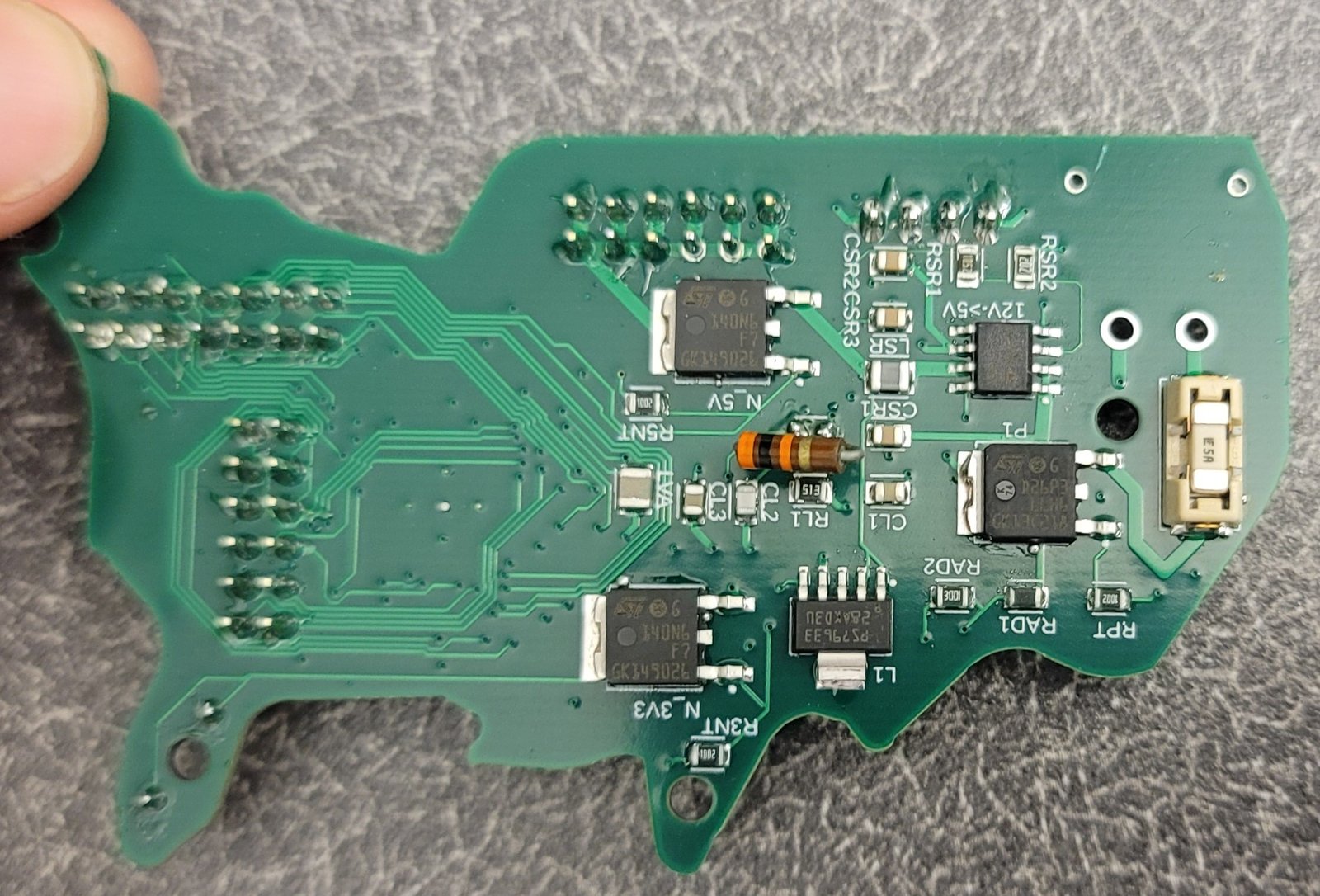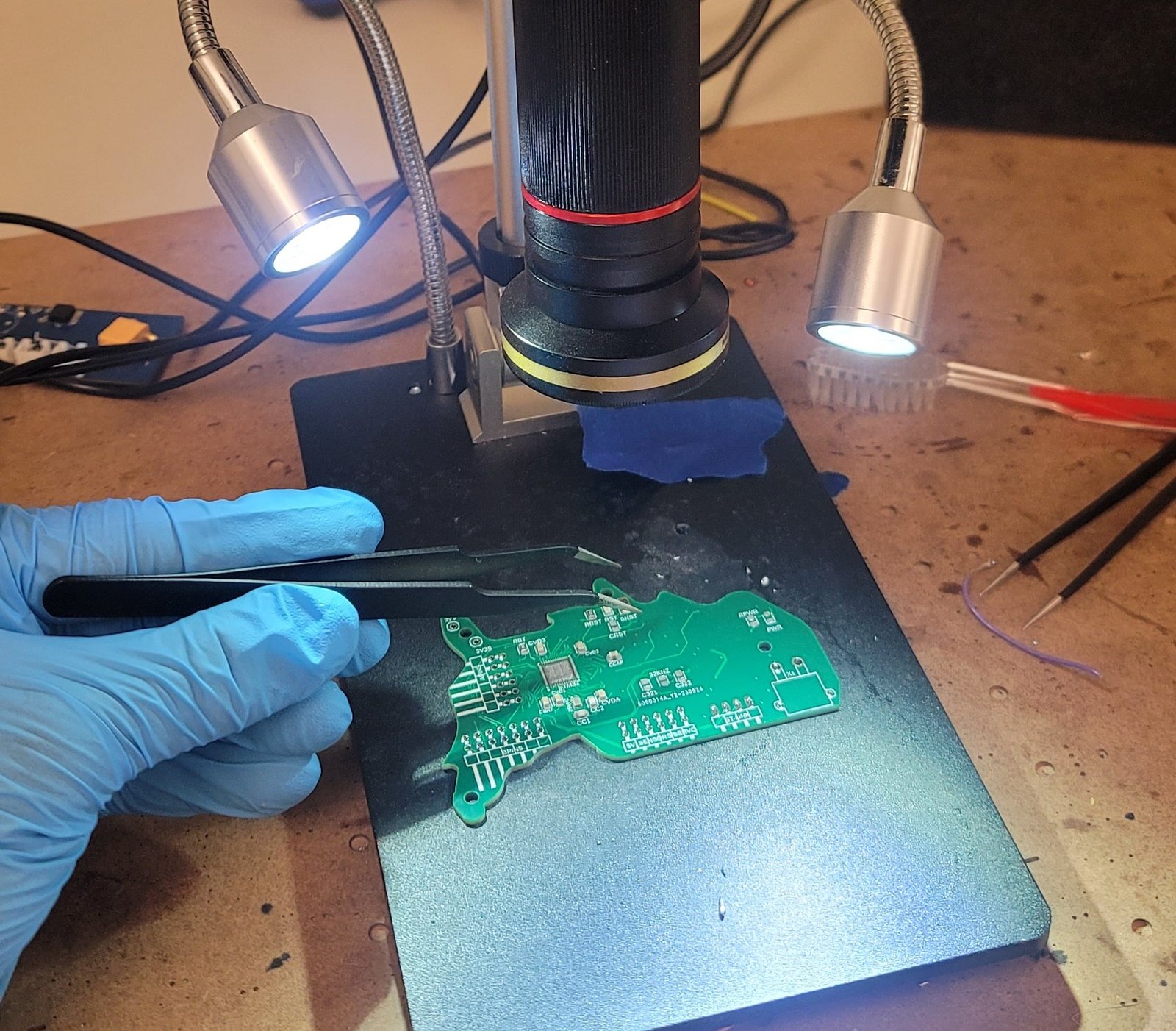 After all our components came in, we realized that we were missing one of our resistors. Due to lack of time, we were unable to order a replacement. However, we were able to use one of the through-hole resistors in the mechatronics lab as a replacement; we soldered on a through-hole resistor to the SMD pads as an emergency fix.