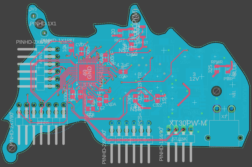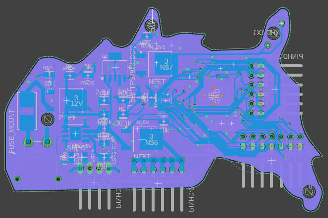 The reason why we put components on both the top and bottom layers was to reduce the overall dimensions of the board and conserve space inside the robot. While this did yield a much smaller footprint, it made it difficult to solder components as we could not just use a template for all; we were able to use a template for the components on the top layer, but had to hand-solder the bottom layer components. The conversion of the 12V input down to 5V and then again to 3V3 was done because the battery we used supplied 12V, most of our sensors and motors required 5V, and our STM (as well as a couple other sensors) needed 3V3. We also chose to shape it like the United States for aesthetics.