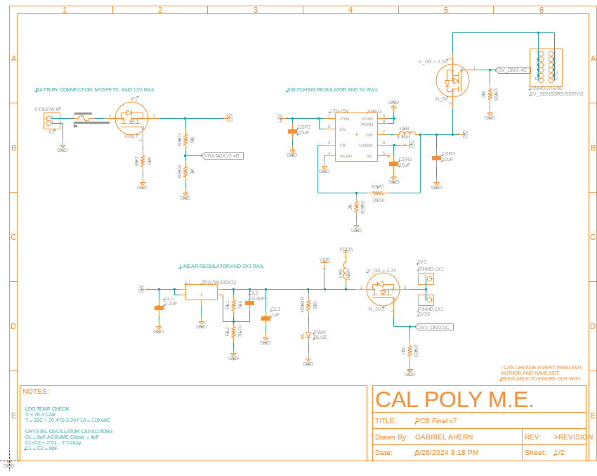 After soldering our components to our pcb we found that the 5V and 3v3 rails were outputting the correct voltage, but the Power LED (Orange LED on the top of the board designed to indicate that power is connected) was not on. While probing the components on the power side of the board, we forgot to disconnect the power supply and accidentally caused a short in the board. Although we replaced the switching and linear regulators (the switching was shorted during probing and the linear was suspected of potentially not being entirely connected since the Power LED was not lit) and found that all power regulators were continuous (checked using the continuity feature on a multimeter), we were unable to find and correct the short in time. We suspect that either the board itself became damaged or that one of the other SMD components was shorted. Because of this, we switched back to the Blackpill for the remainder of the project.