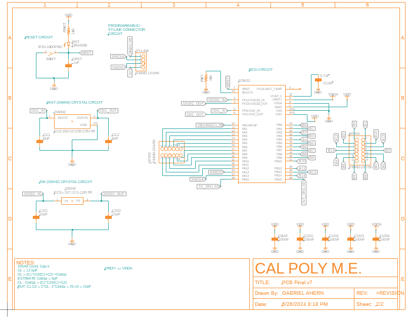 Our PCB design consists of 4 layers: 2 interiors for GND (light blue layer) and 3v3 Power (purple layer), a top layer for the STM MCU and its necessary components (red traces), and a bottom layer for power regulation (dark blue traces). A clearer view of the components and their connections can be seen in the below schematic of the PCB.