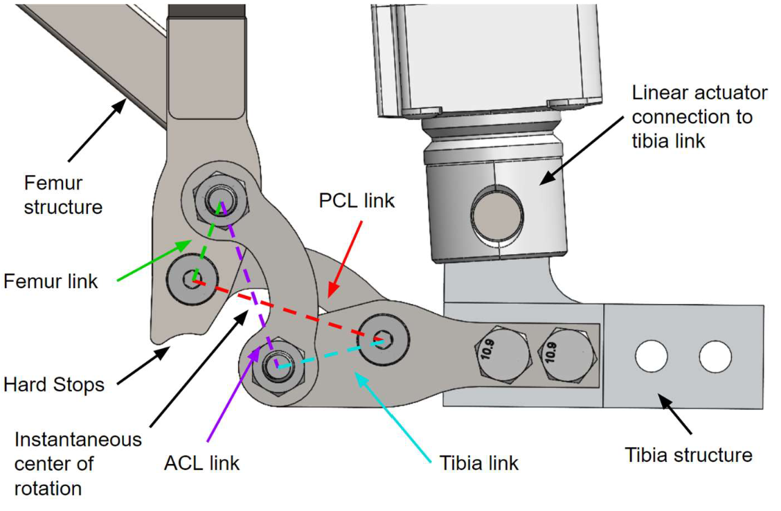 Our joint consists of a four-bar linkage tuned to mimic the natural roll-glide motion of the human knee, powered by a linear actuator (Thomson Linear LL24B040-0100LEXANNSD). The linear actuator is attached to the femur structure and actuates the joint by exerting a force on the aluminum coupler below the tibia link, resulting in a moment about the joint.