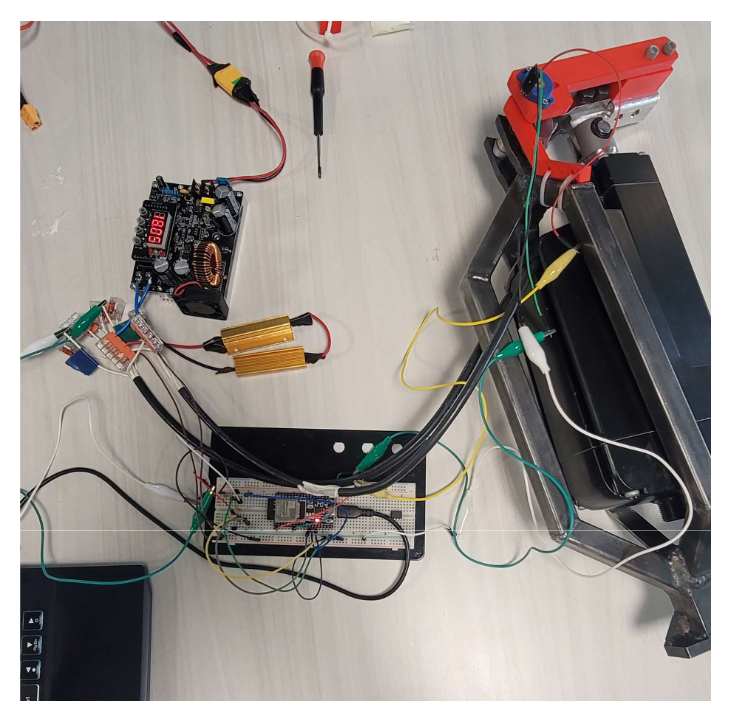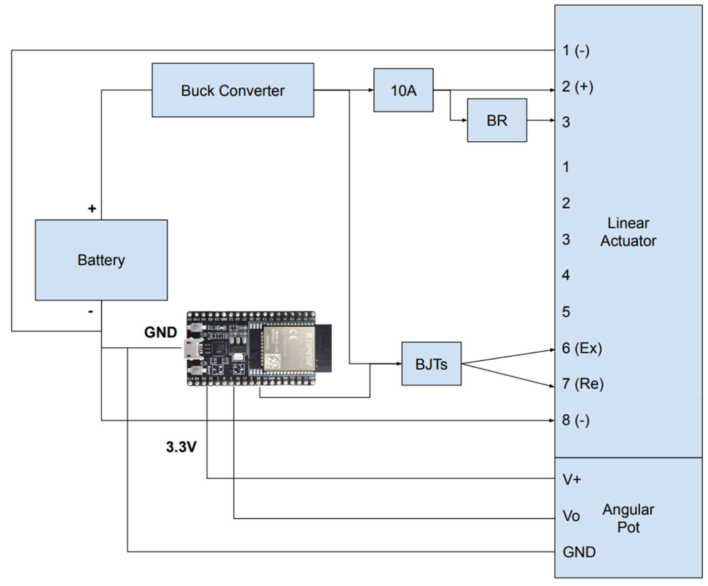To do this, we created a basic P controller that compared the desired angle input to the system to the current angular reading of the potentiometer (converted from an output voltage to an angular reading through a gain developed from calibration and the ESP32 datasheet). The linear actuator will then extend or retract (depending on the current and input angles) until it is within 0.5% of the input angle. A tolerance around the input angle rather than the angle itself was used because of the limited accuracy of the potentiometer and noise in the wiring system.