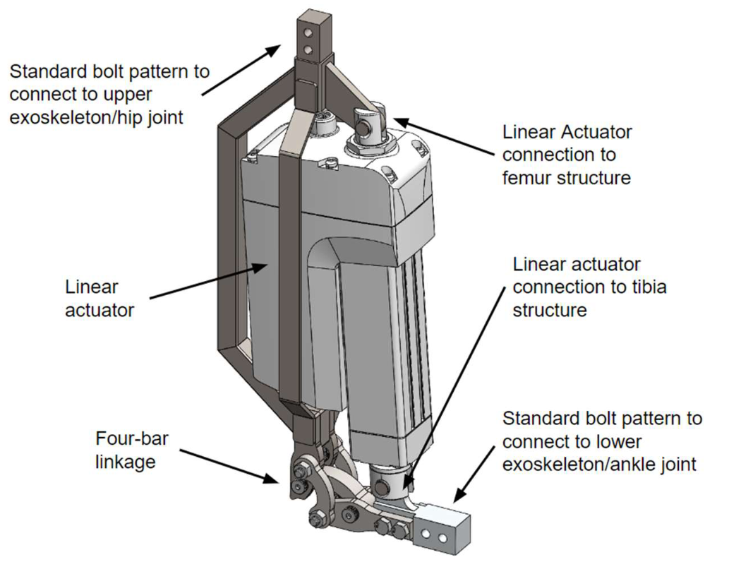 This moment causes the four-bar linkage to rotate, thereby moving the lower leg portion of the exoskeleton. The center of rotation of the joint is located at the intersection of the ACL and PCL centerlines and changes throughout the movement of the joint, mimicking the natural "roll-glide" movement of the human knee. The overall design is approximately 18 inches tall (when joint is at the 90-degree/fully retracted position), 7.5 inches deep (measuring from the front of the frontal support structure to the back of the linear actuator), and 4 inches wide (from the exterior to interior of the support structure).