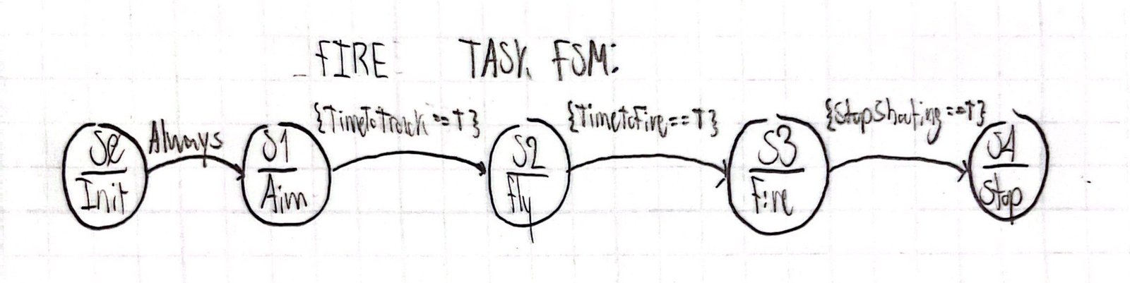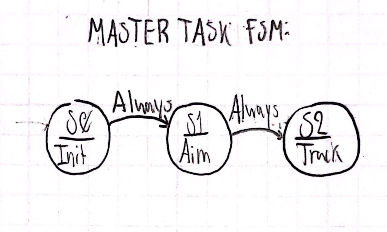 The master task shares the current turret status with all other tasks. When the master task is initilized it moves into it's state 1, where it sends the pitch and yaw motors to move to their initial positions. It next waits until 4.9 seconds, in which it will then send a signal to the motors to begin following the target based on the position data sent by the camera task, and for the flywheels to begin spinning up. Once 5 seconds has been reached, if the yaw and pitch motors are both on target, fire the dart by articulating the servo motor. Once the ten second firing window passes, powerdown the flywheels and send the yaw motor back to its starting position. The FSM for the task is above.